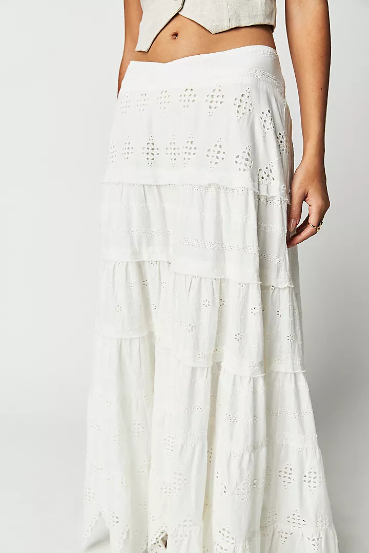 Features: Elastic waistband for pull-on ease, tiered design, eyelet lace paneling, front pointed waistband, asymmetrical hemline