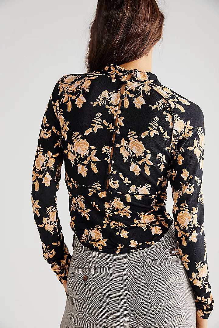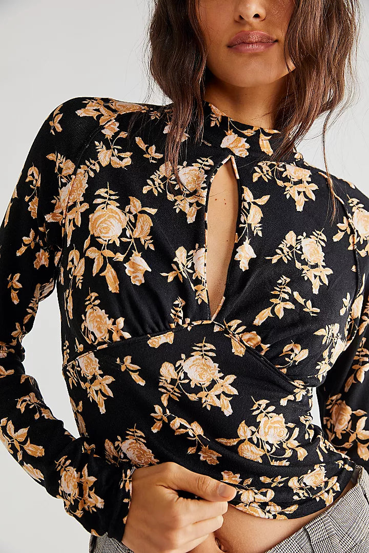 Forever cool and just as classic, this femme, floral printed top is featured in a fitted, high-neck silhouette with defined keyhole cutout at center for added dimension.