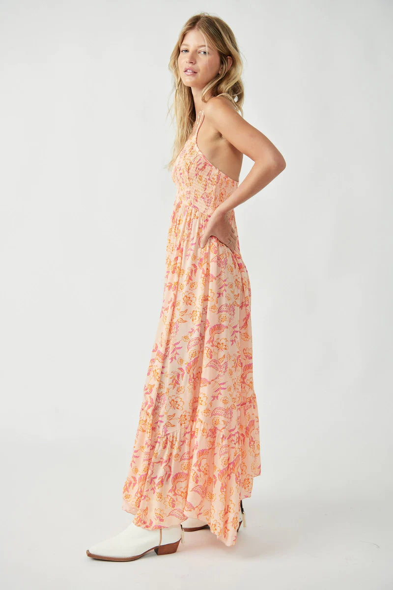 Floral print maxi slip featuring a tiered A-line skirt with a handkerchief hem, a high-neckline and a smocked bodice.
