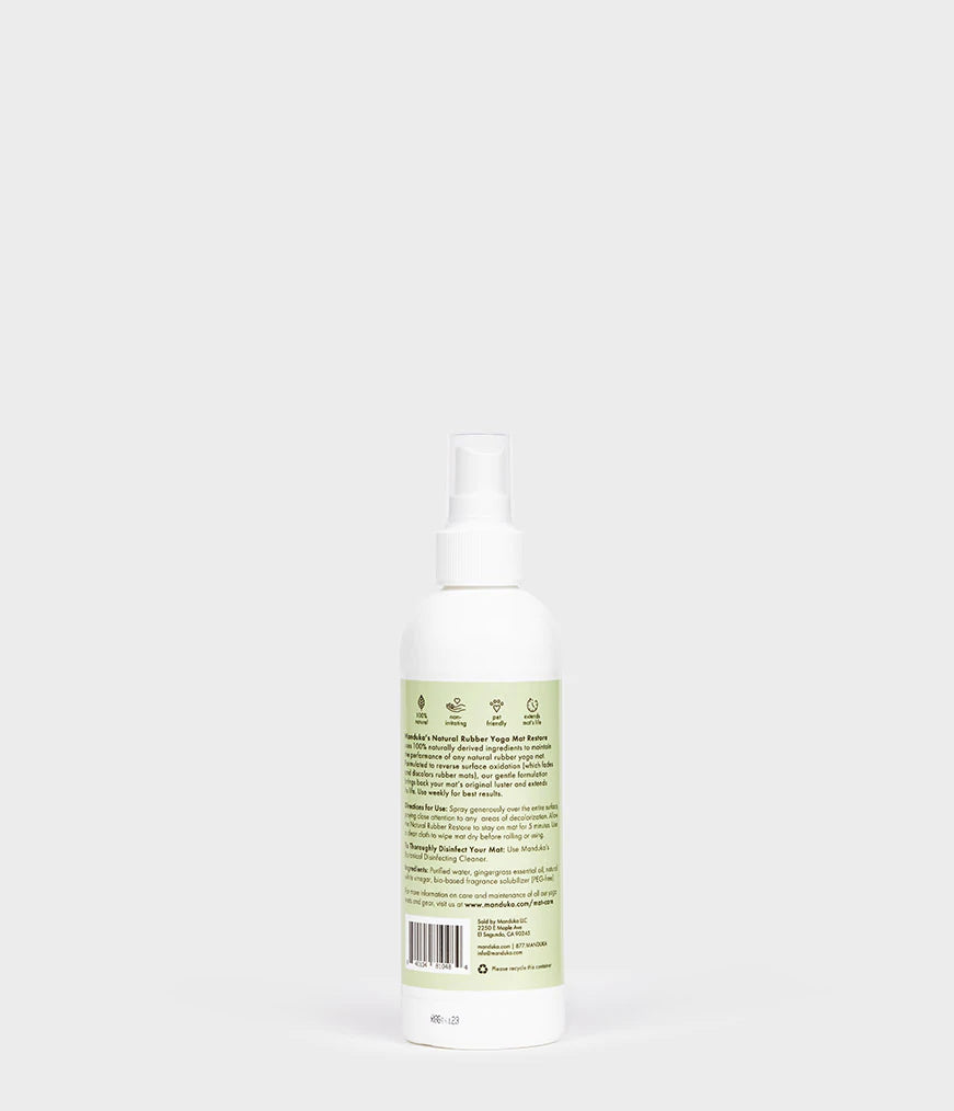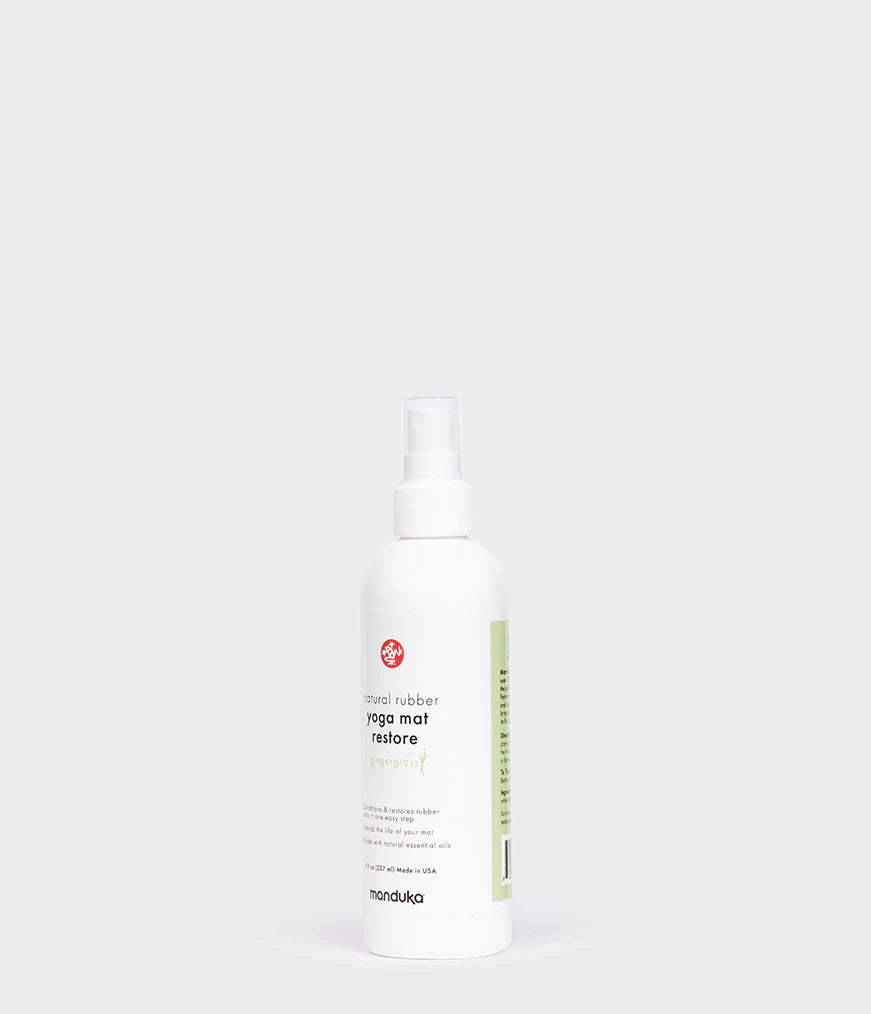 Manduka’s Natural Rubber Yoga Mat Restore uses 100% naturally derived ingredients to maintain the performance of your eKO Series yoga mat. Natural Rubber Yoga Mat Restore can be used on any natural rubber yoga mats. Formulated to reverse the surface oxidation (which fades and discolors rubber mats), our gentle formulation brings back your mat’s original luster and extends its life. Use weekly for best results.
