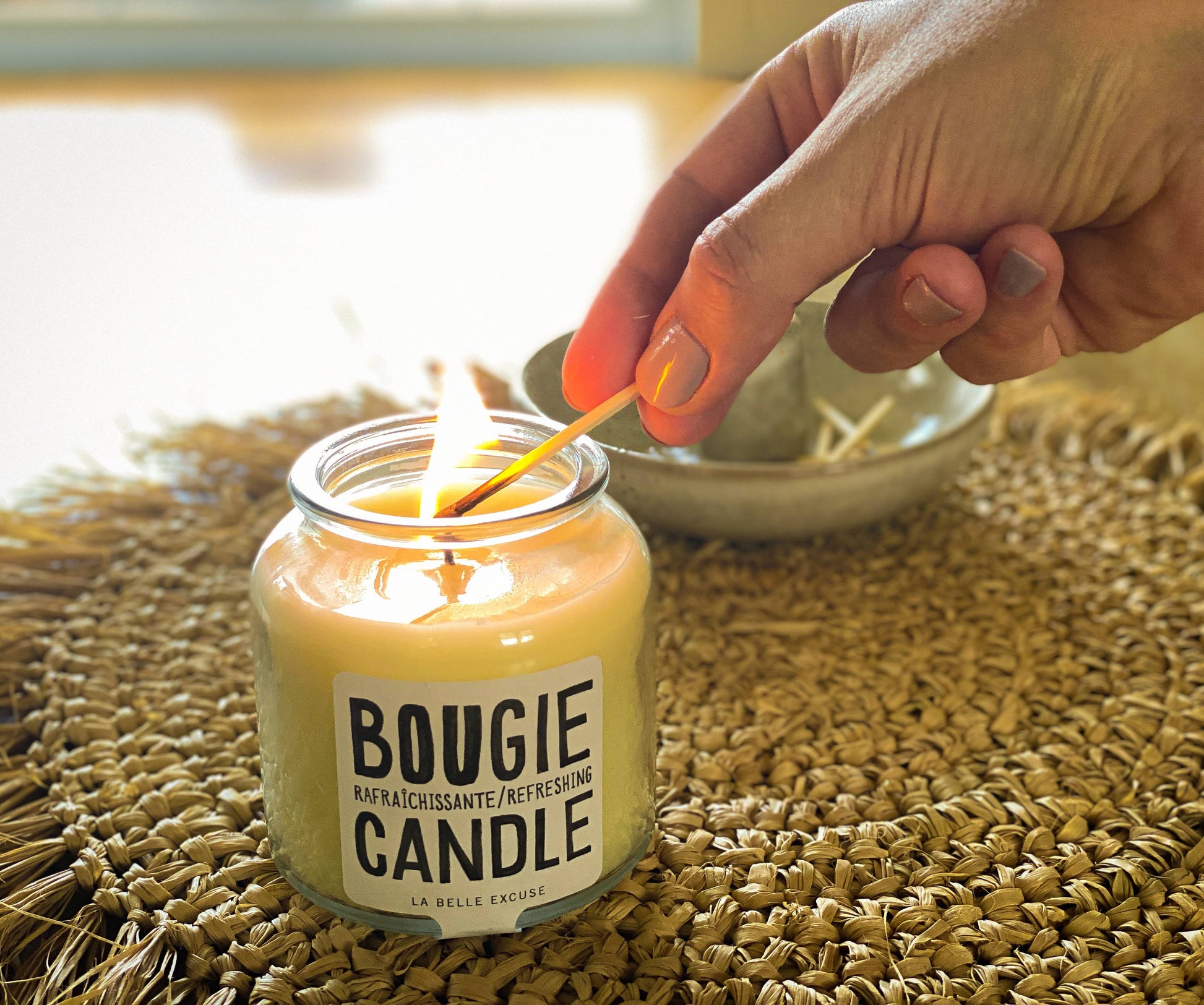 Introducing the Refreshing Candle made of soy wax and olive oil with a delicate citrus scent by La Belle Excuse. It's offered in an elegant reusable glass jar, covered with a cork lid.
