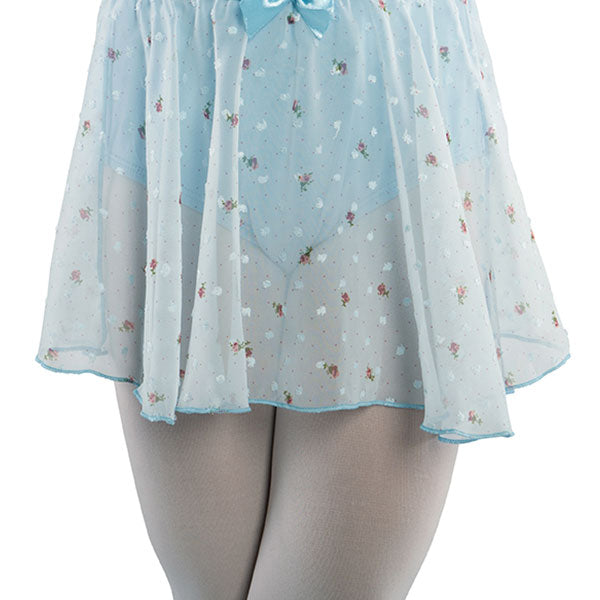 Chiffon circle skirt featuring small rose print, elasticized waist with bow and rhinestone accent.